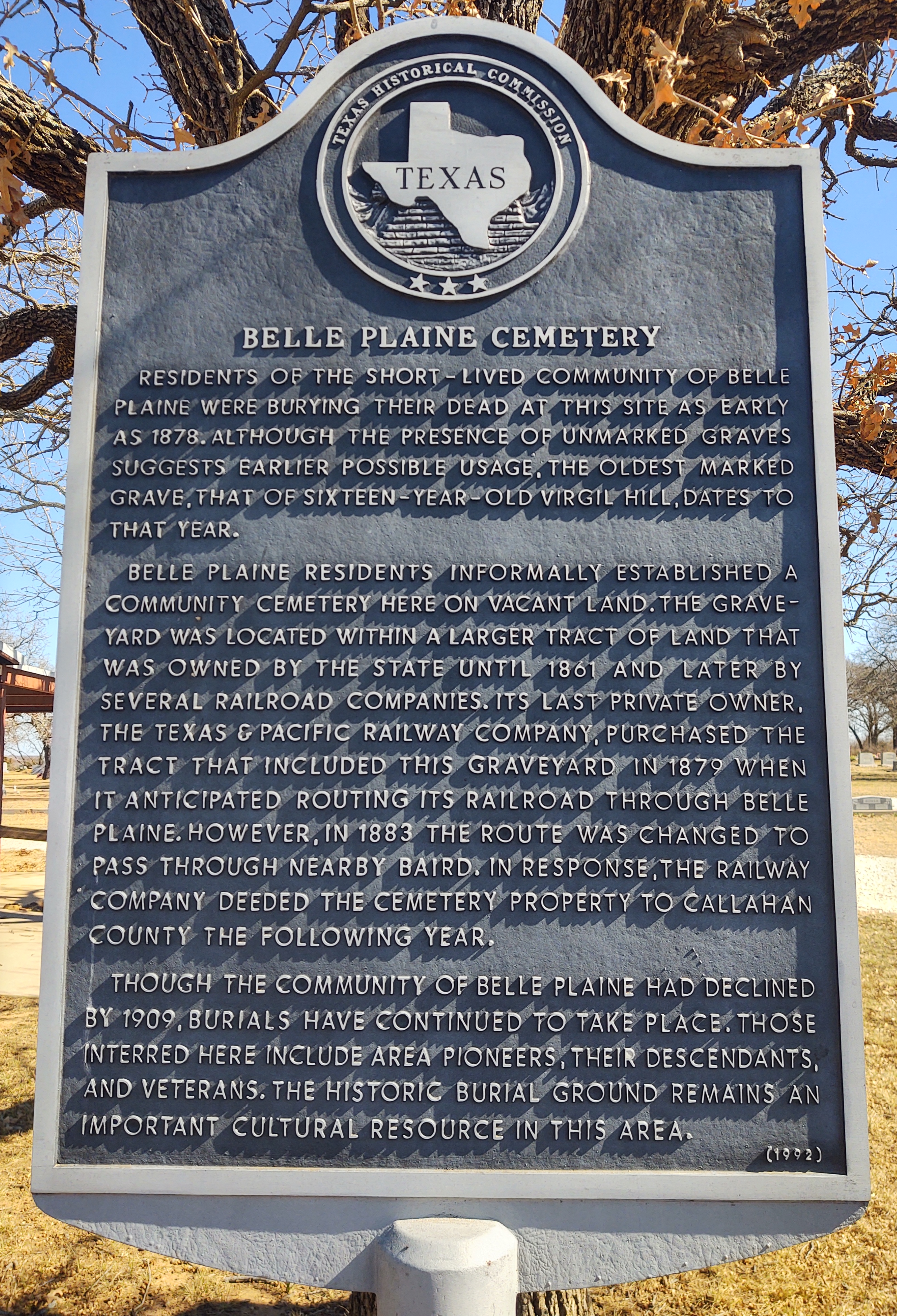 Located in Callahan County, Belle Plain was established in the 1870’s. It served as the county seat until the railroad diverted the population to Baird in 1883. Once the county seat moved, the decline was rapid. The college closed in 1892 and by the end of the 1890’s, only a handful of families remained. There’s not much left to see except for some ruins from a distance and the cemetery. To get to the markers, we had to drive on a dirt road (February 2021).